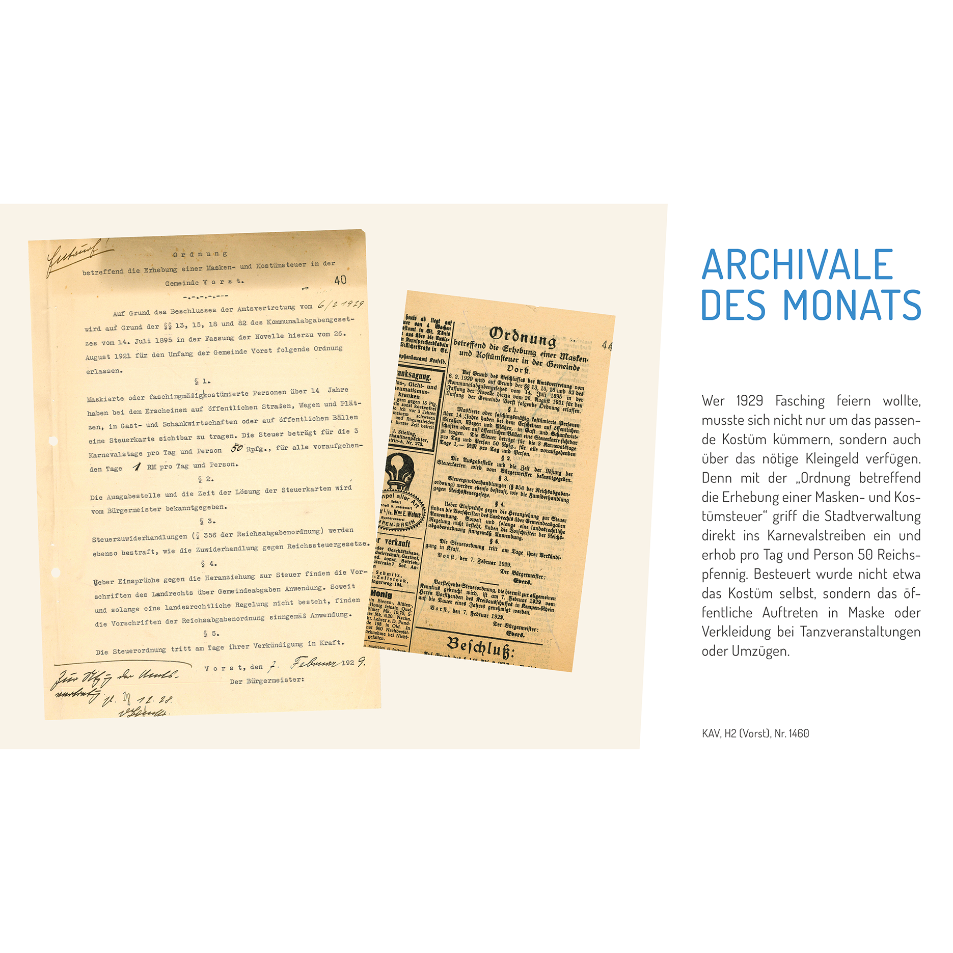 KAV, H2 (Vorst), Nr. 1460. Wer 1929 Fasching feiern wollte, musste sich nicht nur um das passende Kostüm kümmern, sondern auch über das nötige Kleingeld verfügen. Denn mit der „Ordnung betreffend die Erhebung einer Masken- und Kostümsteuer“ griff die Stadtverwaltung direkt ins Karnevalstreiben ein und erhob pro Tag und Person 50 Reichspfennig. Besteuert wurde nicht etwa das Kostüm selbst, sondern das öffentliche Auftreten in Maske oder Verkleidung bei Tanzveranstaltungen oder Umzügen.
